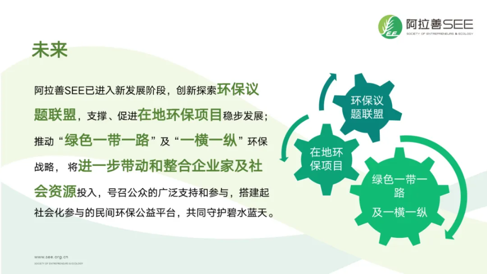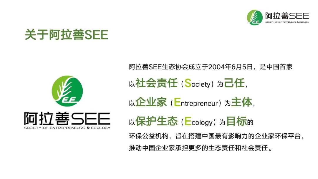 阿拉善SEE生态协会成立于2004年,由近百名企业家在内蒙古阿拉善腾格里沙漠发起。是中国首家以社会责任(Society)为己任,以企业家(Entrepreneur)为主体,以保护生态(Ecology)为目标的社会团体。