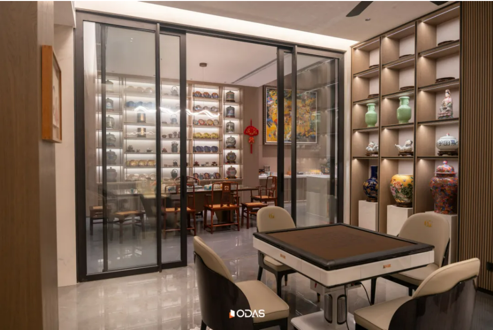 巧借天光,一方精心留白的天井,如同自然之眼,穿透了地下的沉寂,与欧大师门窗匠心打造的DP127二轨提升推拉门相得益彰,将外界的明媚无缝衔接至茶室的清幽、棋牌室的智趣、影视厅的梦幻之中,即便是细雨绵绵之日,亦能感受一室光明。DP127二轨提升推拉门的自动感应功能,引领宾客穿梭于各个休闲秘境,行云流水,自在无碍。在这里,可以品茶闲叙、可以智慧博弈、可以放声高歌,温馨惬意,宾主尽欢。