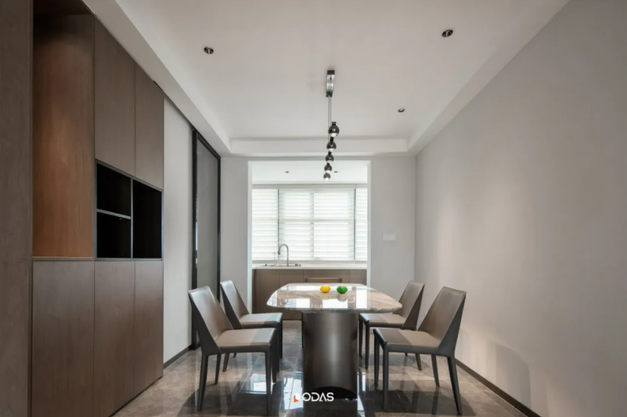 外墙环抱嵌入WO86外开窗,其作为欧大师门窗首代旗舰之作,内含欧大师门窗独创的O5隔热保温降噪系统,优越的隔热性能让厨房有光感无热感,烟熏色餐椅搭配岩板餐桌,映射的自然光营造出温暖的氛围,空间、光、人三者和谐有序,相辅相成。