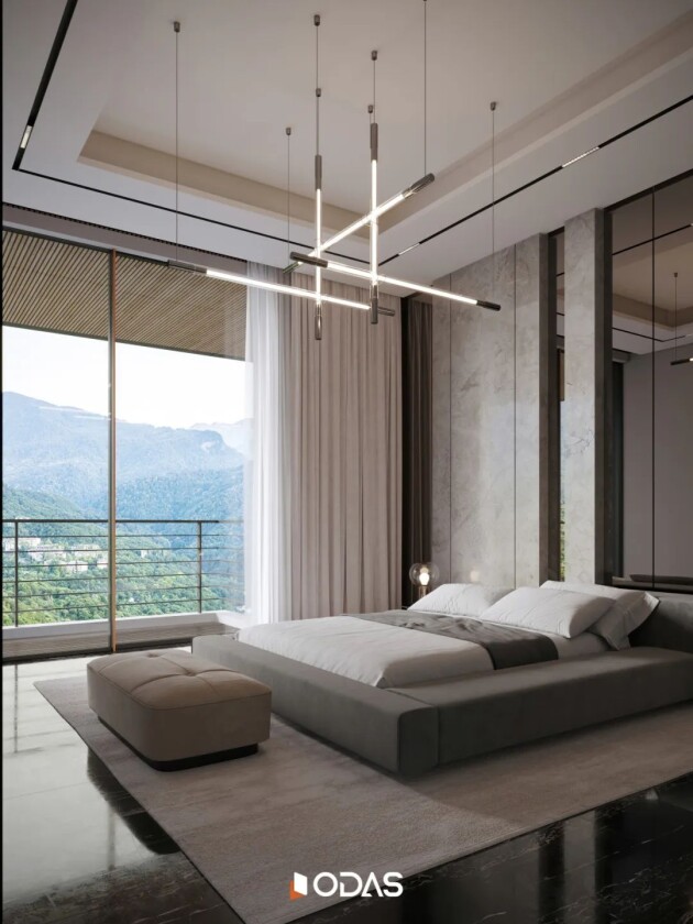 项目主卧室的设计展现出一种朴素、温馨、轻松、谦逊又充满内在智慧的优雅气质。注重私密性和舒适度,引入窗外美景,将大自然的包容性与家庭的温馨氛围完美交融。