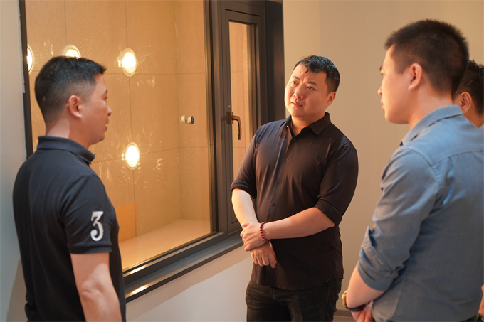 首先,一行人参观了新落成的欧大师隔热门窗展厅,欧大师隔热门窗研发总监刘胜详细介绍了欧大师隔热门窗的产品功能及技术成果,并现场演示了保温窗、被动窗、推拉窗、提升窗等新产品。通过讲解,南国鼎峰装饰团队对产品功能以及创新成果有了一个全面的了解,在参观过程中对欧大师的实力表示出充分的赞赏和认可,认为欧大师在门窗的隔热性、水密性、气密性、抗风压、弧度、质感等方面都实现了技术性的突破,切实体现出高端隔热门窗的定位,也完美诠释了“冬暖夏凉·低碳世界”这一品牌理念。